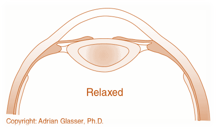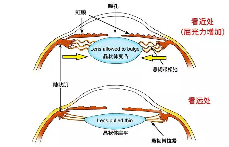 晶状体相当于一个凸透镜,也就是可以根据自身的需要来调节它的弯曲程度,来改变焦点的远近达到看清视物的目的,眼睛在看近的时候,需要通过晶状体的调节,在调节上越费力,反应在自我感觉上就是眼睛疲劳。