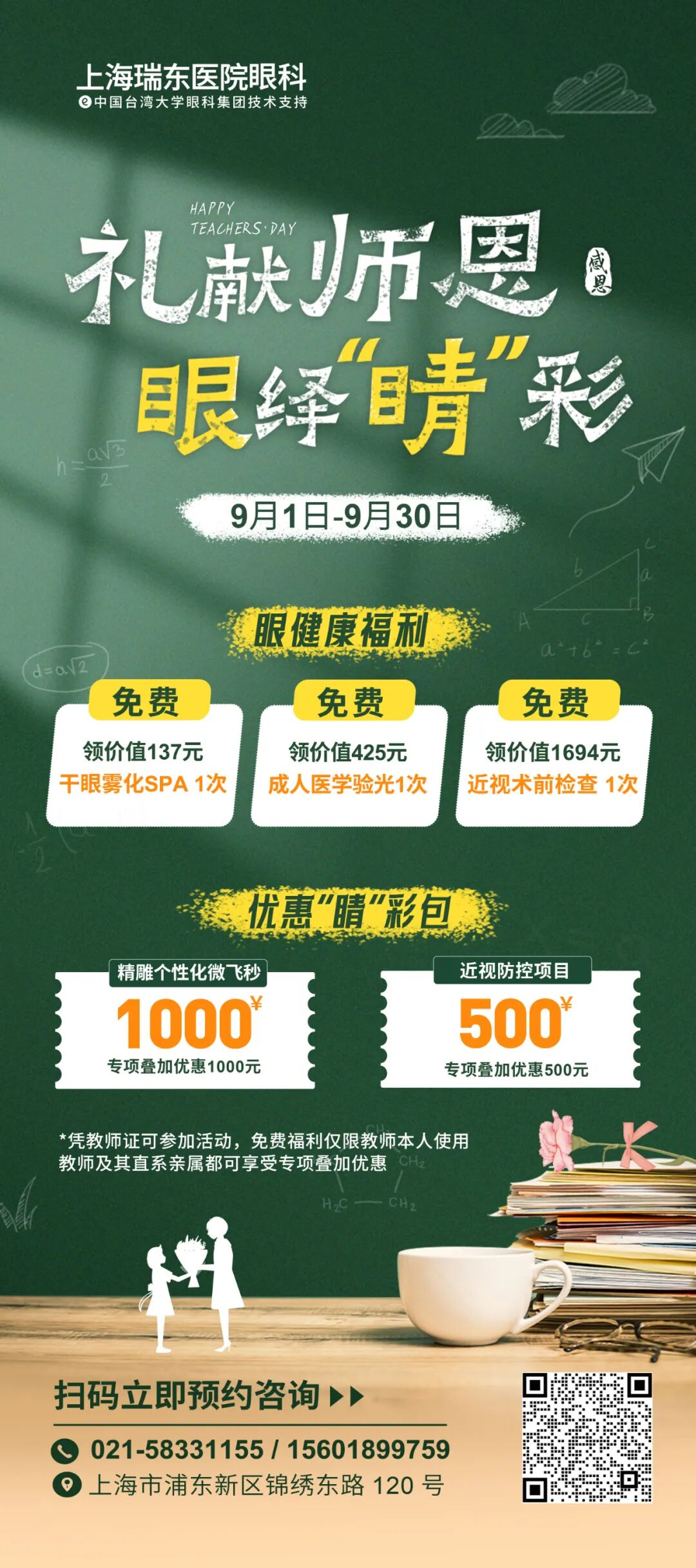 9月1日-9月30日,凭借教师资格证,可免费领取眼健康福利!教师及其亲属共享专项叠加优惠~